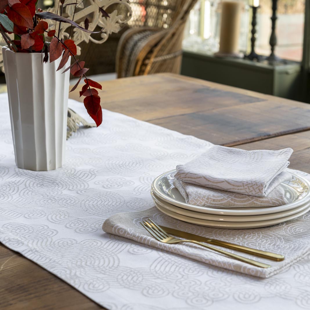 The blanc/lin Méandre napkin combines cotton and linen for a texture that is both natural and refined. Worked in mirror image, the two towels reveal the graphic pattern designed by Baptiste Vandaele, in a subtle interplay of materials and contrasts echoing the Méandre table runner, also woven in cotton and linen.