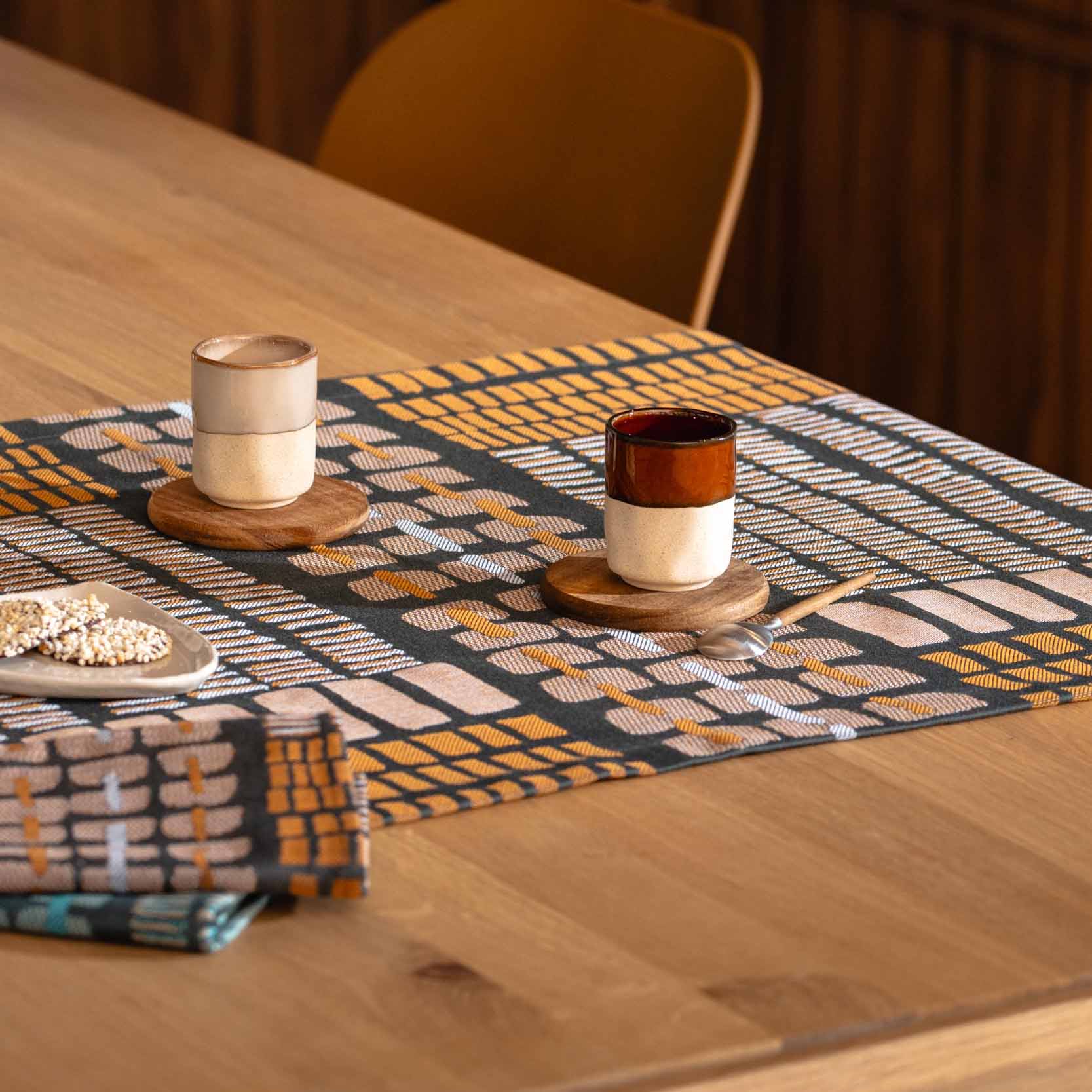 Imaginé en collaboration avec la créatrice textile Laure Vissian, le chemin de table Écailles offre un jeu délicat de formes et de textures en mouvement, inspiré par la nature et les jeux de lumière. Tissé en Jacquard dans notre atelier d’Orthez, il témoigne de notre engagement pour un linge de table à la fois raffiné et créatif.